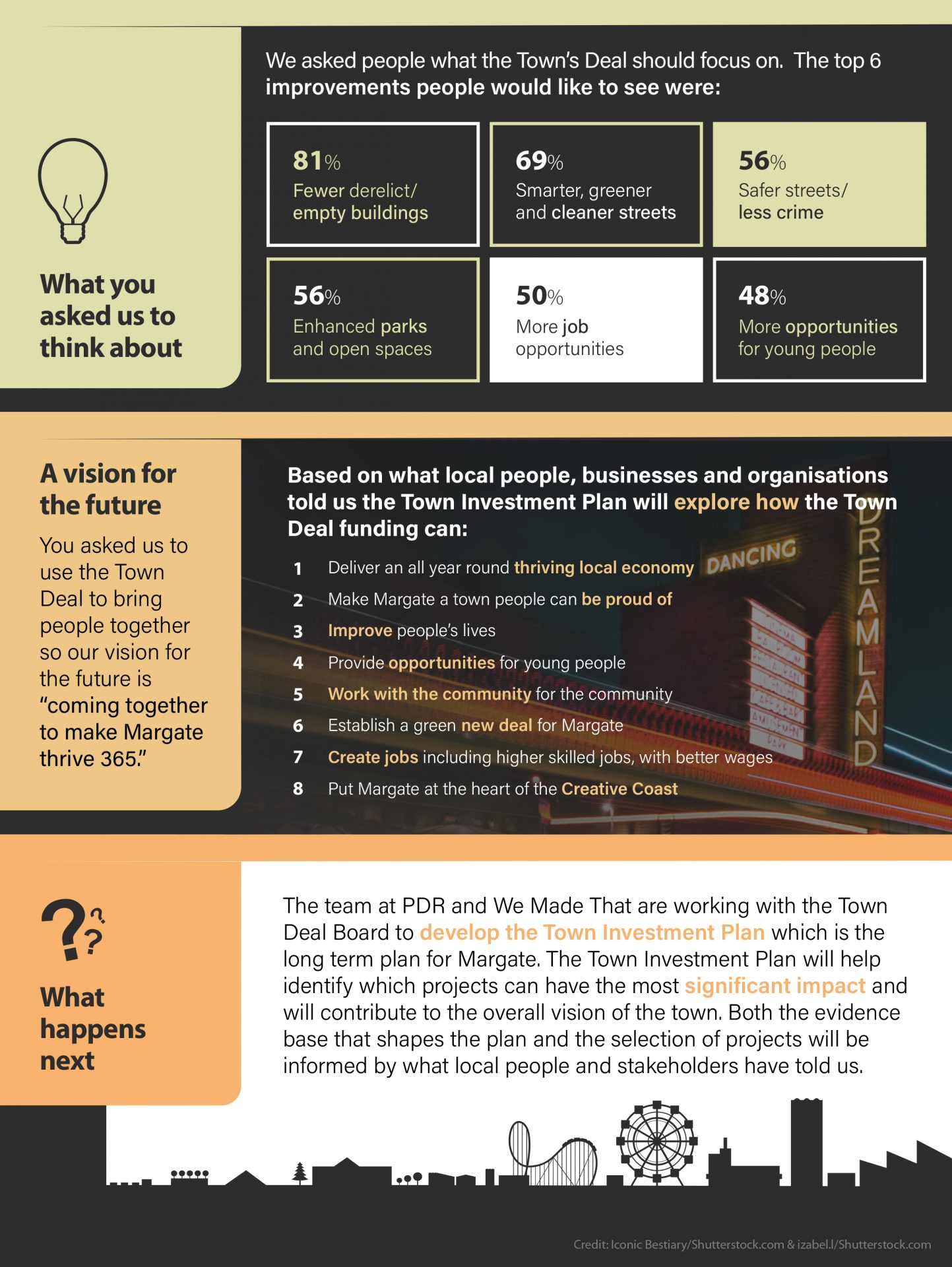 More information about the community, stakeholder and business engagement that has been fundamental to the development of the Town Investment Plan can be found here. You can find the full engagement report and an infographic summarising what people told us about Margate now and in the future.